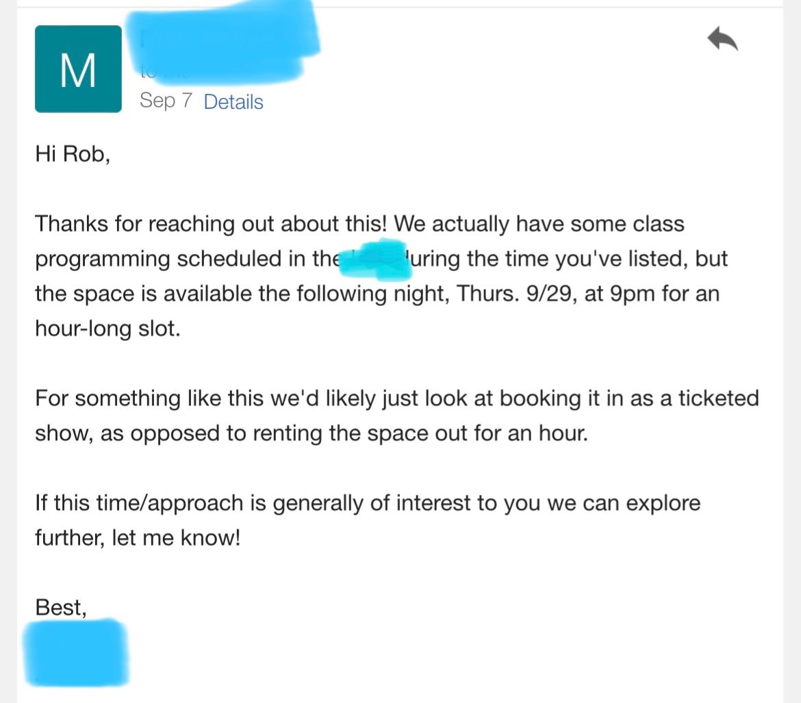 They agreed to let me use their space without needing me to sell tickets or pay $500/hr.